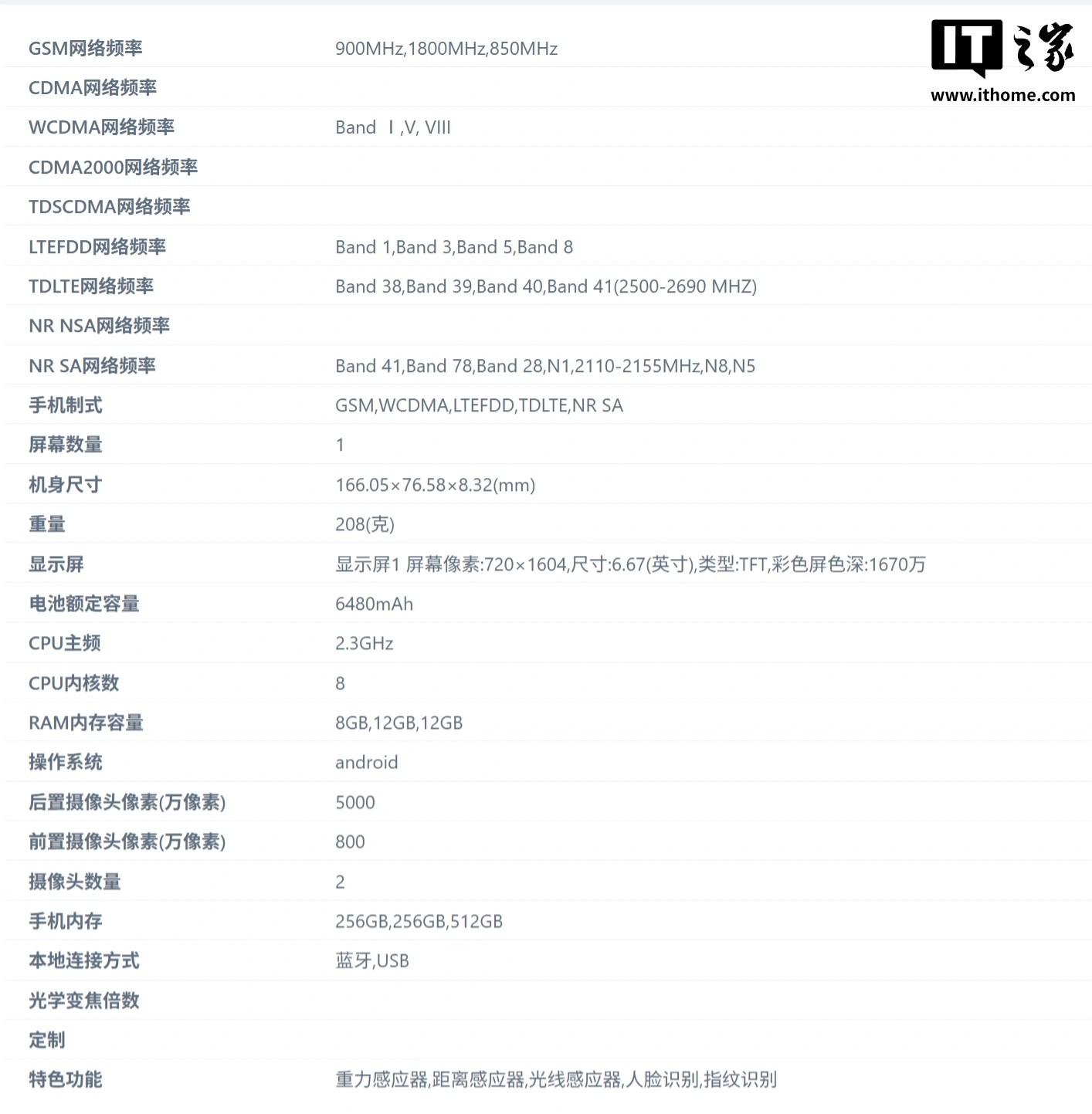 IT之家查询电信修复末端网发现,这款手机由唯科末端技巧(东莞)有限公司坐褥,配备 8 中枢处分器,CPU 主频可达 2.3GHz,屏幕分辩率为 720*1604(720P),维持 NR SA、TD-LTE、WCDMA 等通讯制式。